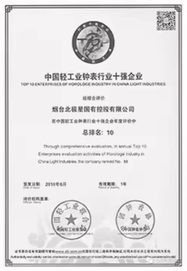 北極星鐘表榮獲“中國(guó)輕工業(yè)鐘表行業(yè)十強(qiáng)企業(yè)”