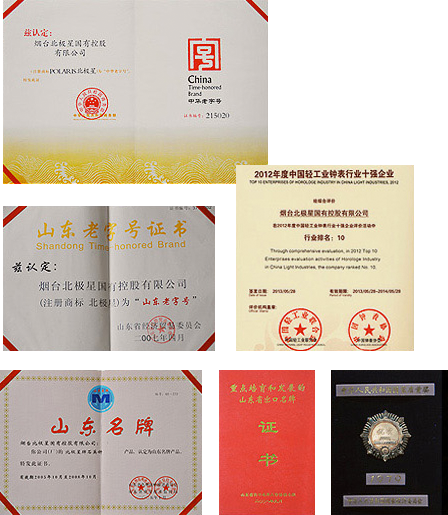 2013年北極星被中國輕工業(yè)聯(lián)合會授予年度“鐘表行業(yè)十強(qiáng)”,在此之前企業(yè)先后獲得“商務(wù)部重點(diǎn)培育和發(fā)展的出口名牌”、“山東老字號”、“國家優(yōu)質(zhì)獎”等一系列榮譽(yù)稱號。