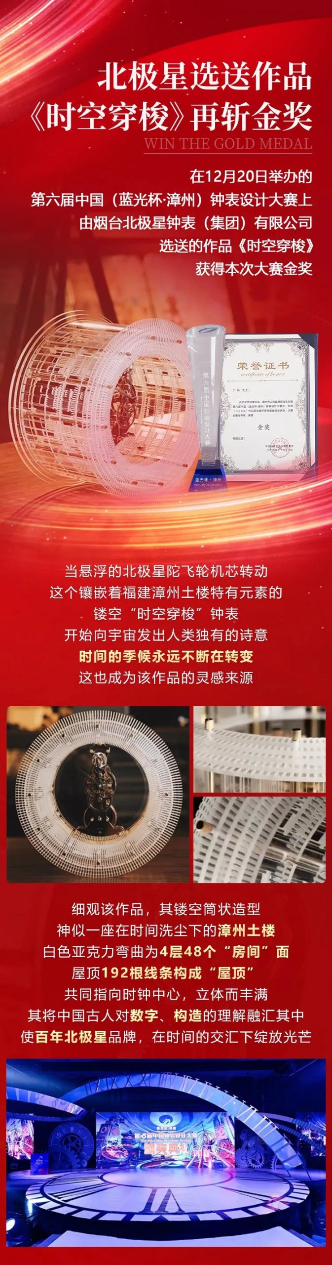 在12月20日舉辦的第六屆中國(藍(lán)光杯.漳州)鐘表設(shè)計(jì)大賽上,由煙臺(tái)北極星鐘表選送作品《時(shí)空穿梭》獲得本次大賽金獎(jiǎng)